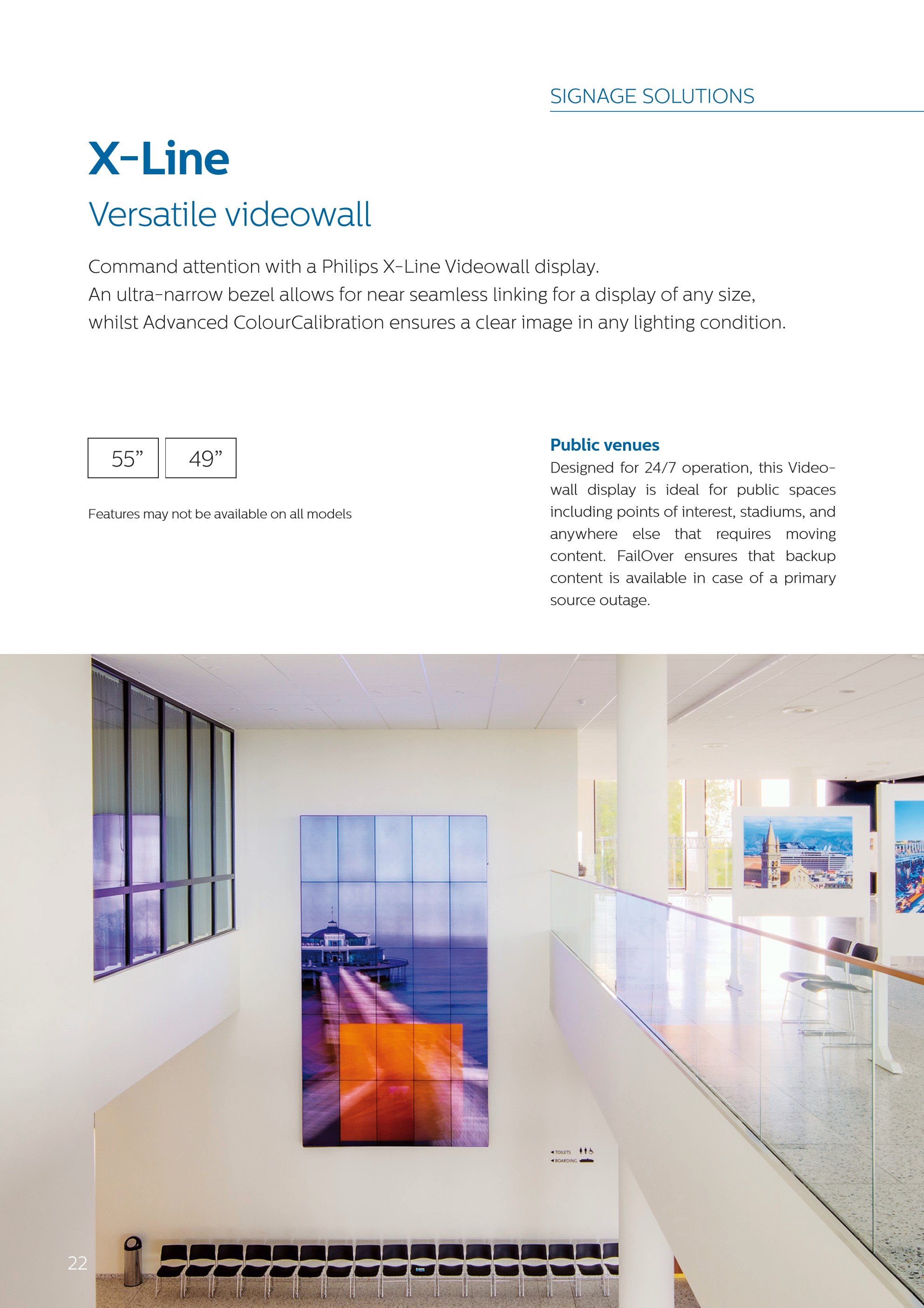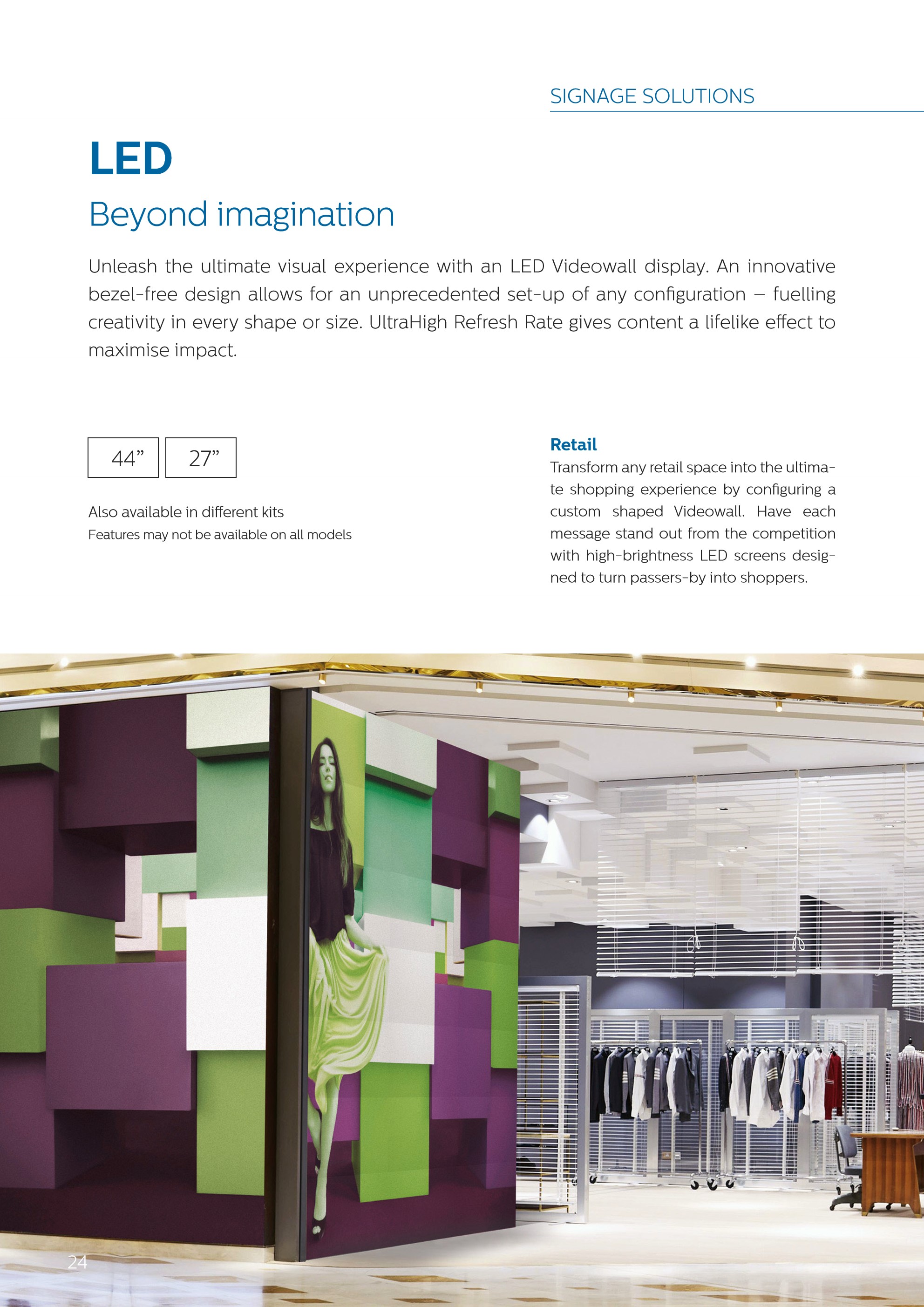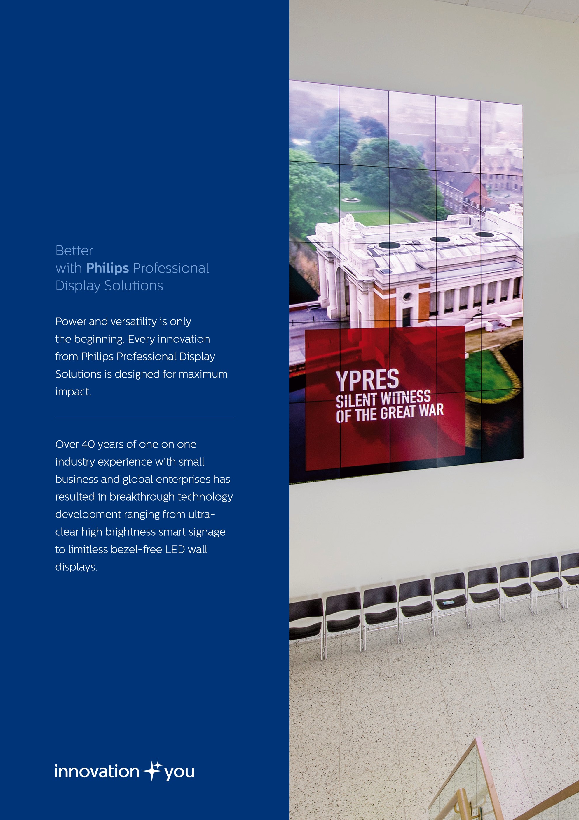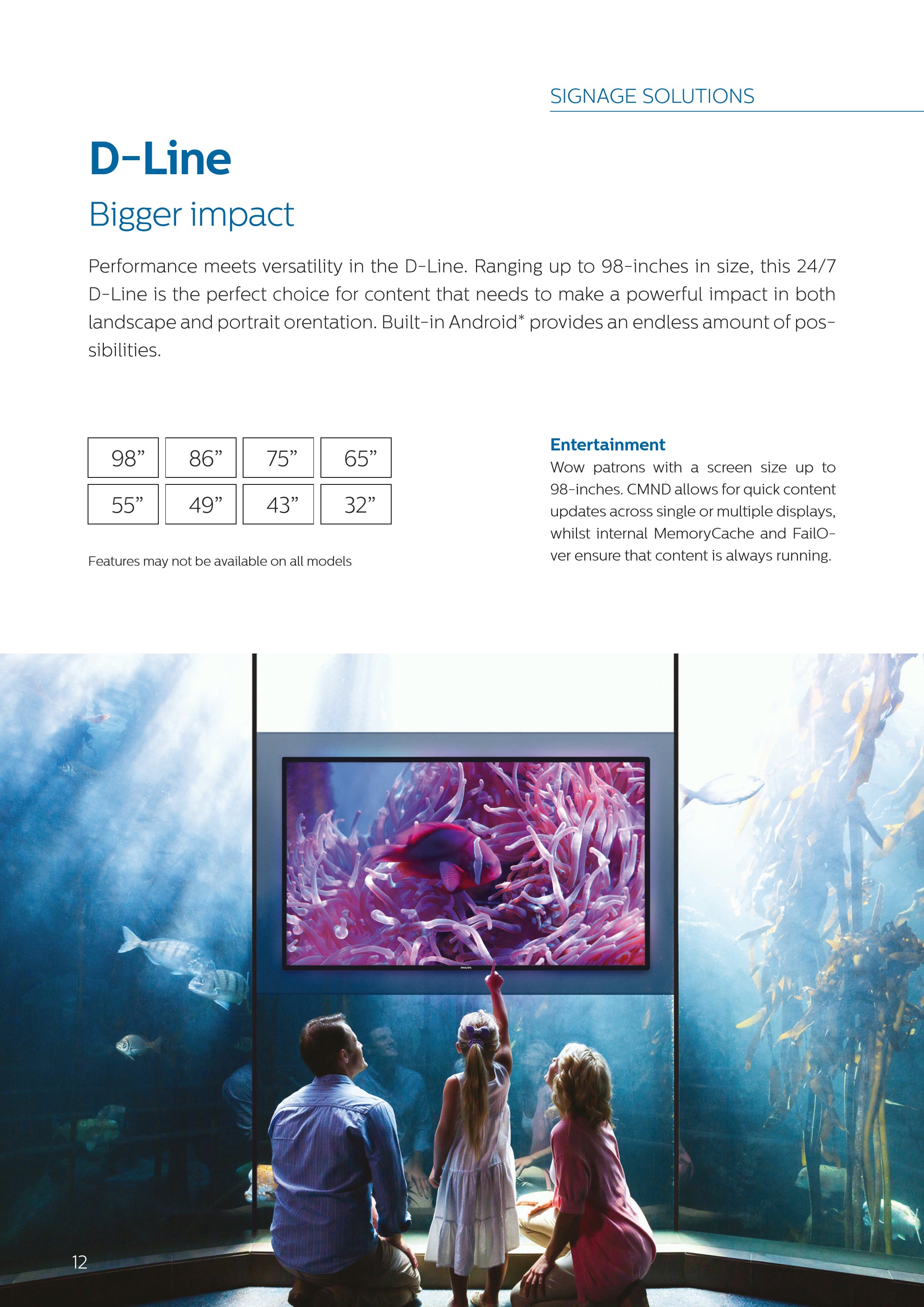 Working with the team at Philips Professional Display Solutions, I had the privilege of creating their annual product range brochure of professional displays and signage solutions. This range discovery guide is one of the most significant business to business pieces for the brand, comprising the entire collection, and published across all global markets. I crafted the identity and copy for each product, as well as the copy for the various technologies. I also formulated a content structure to make it easy for the reader to understand the advantages of each product based on their vertical market.