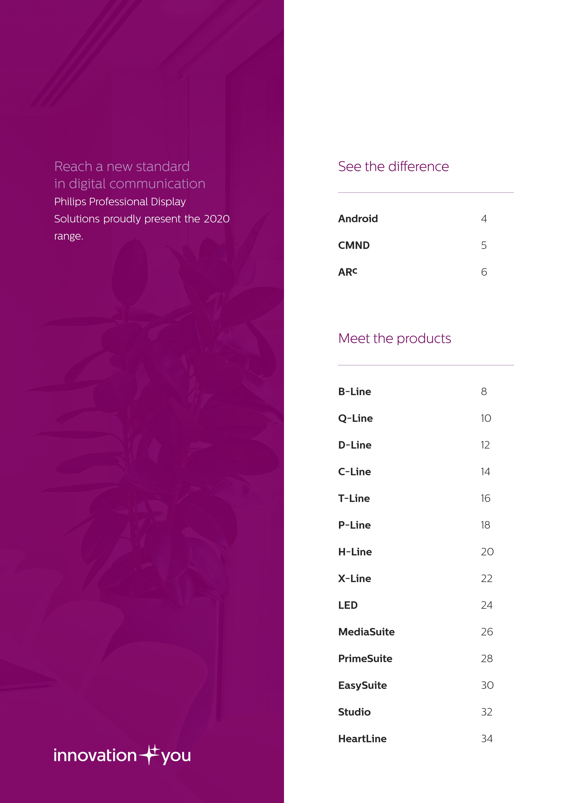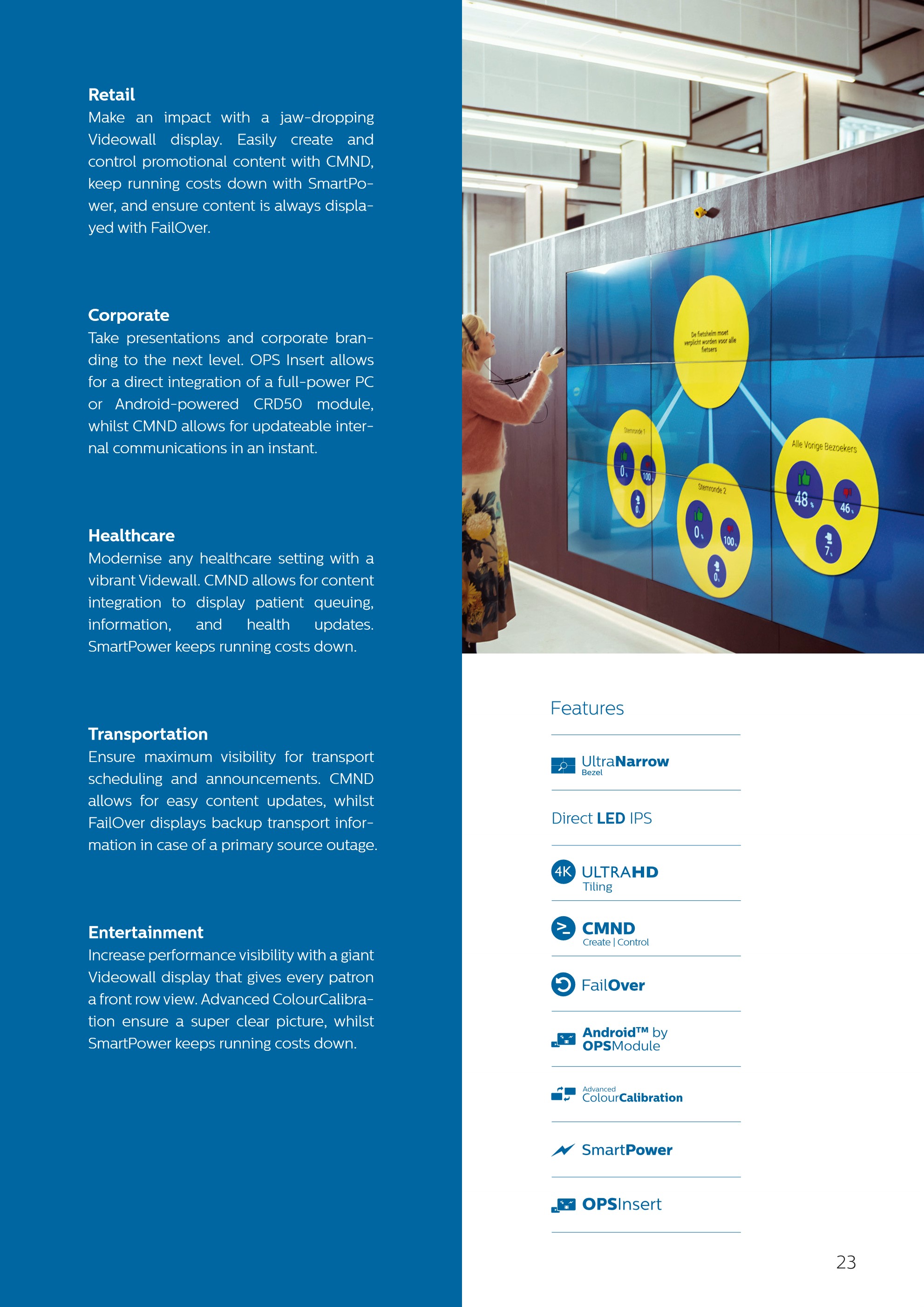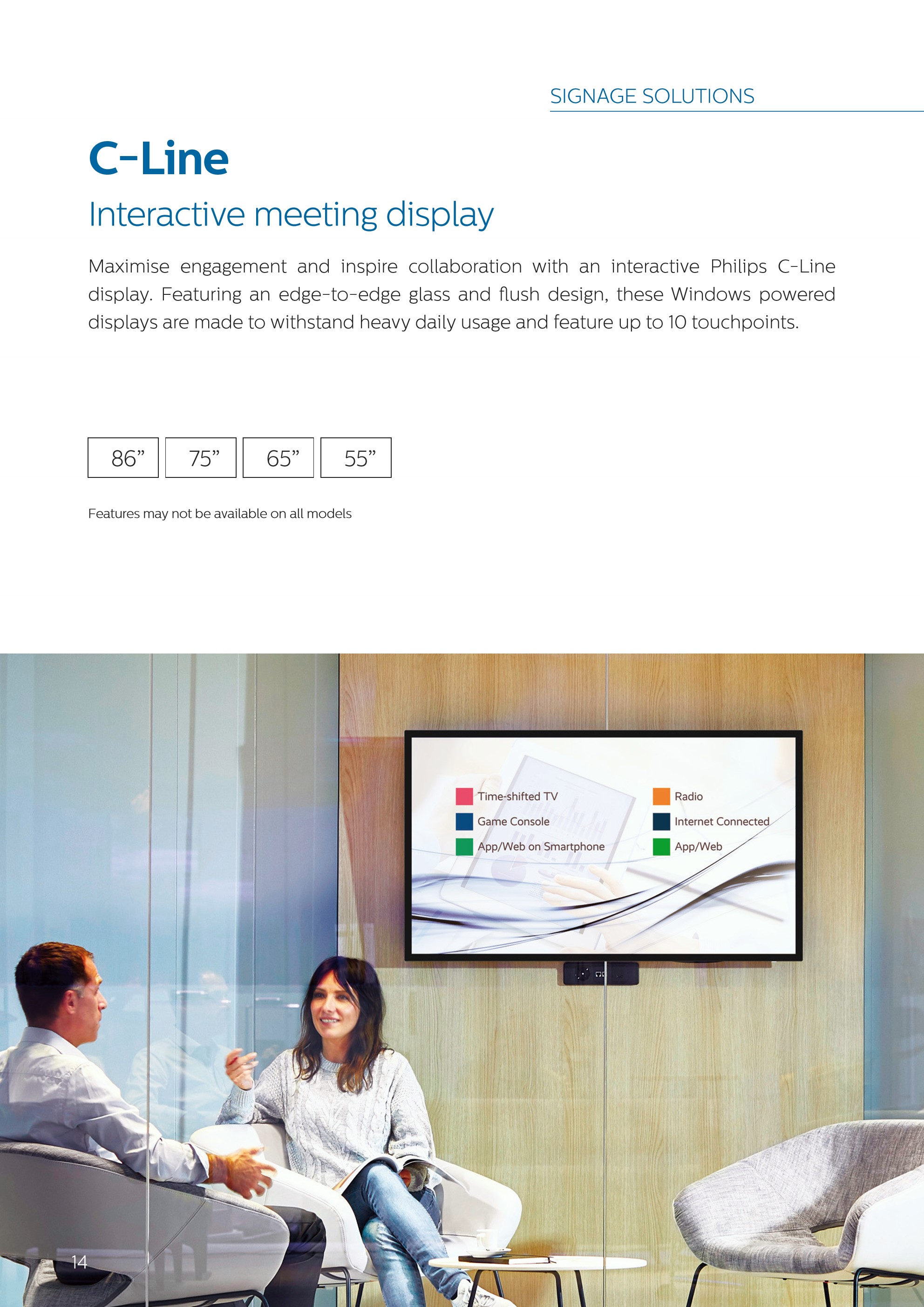 Working with the team at Philips Professional Display Solutions, I had the privilege of creating their annual product range brochure of professional displays and signage solutions. This range discovery guide is one of the most significant business to business pieces for the brand, comprising the entire collection, and published across all global markets. I crafted the identity and copy for each product, as well as the copy for the various technologies. I also formulated a content structure to make it easy for the reader to understand the advantages of each product based on their vertical market.