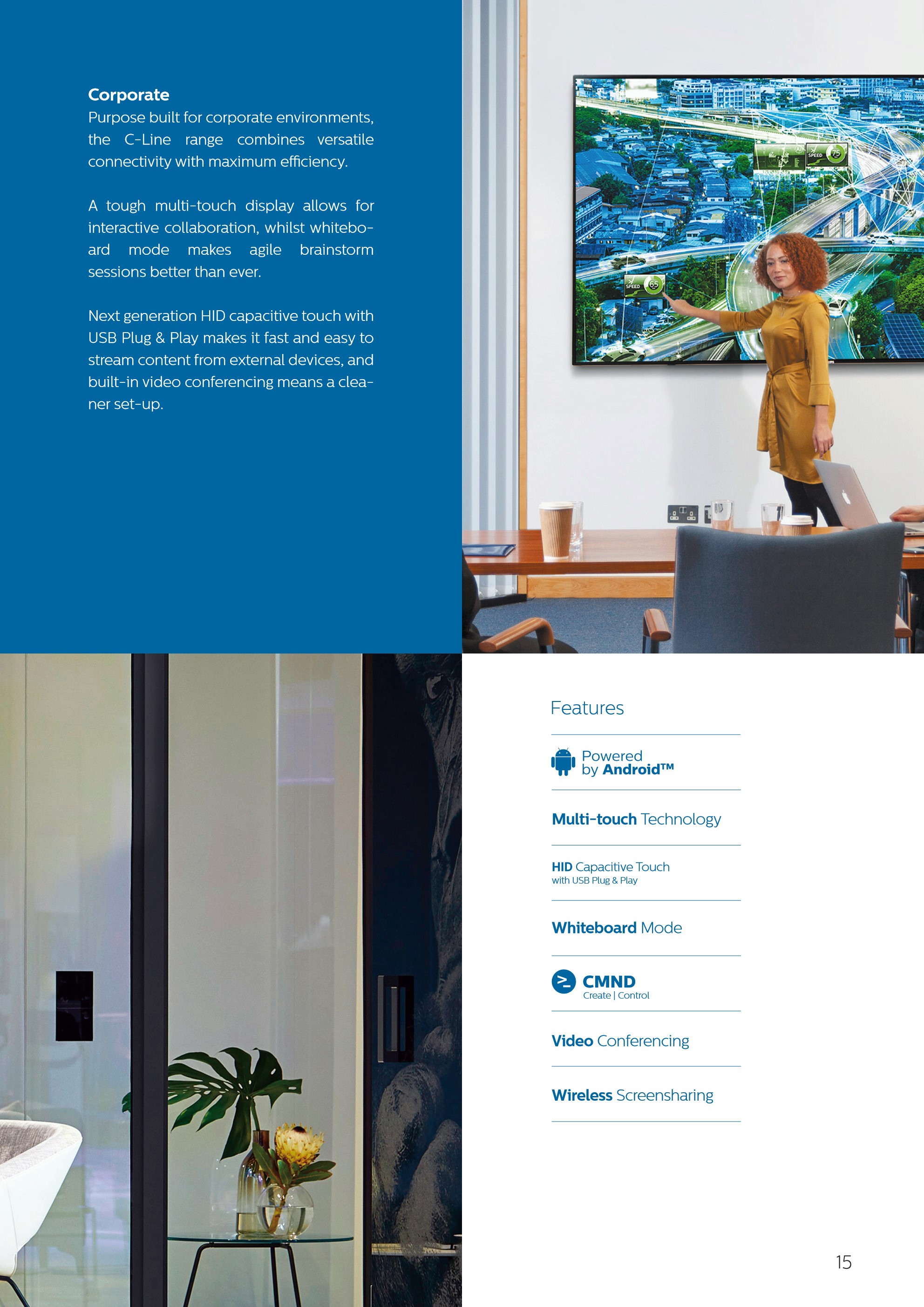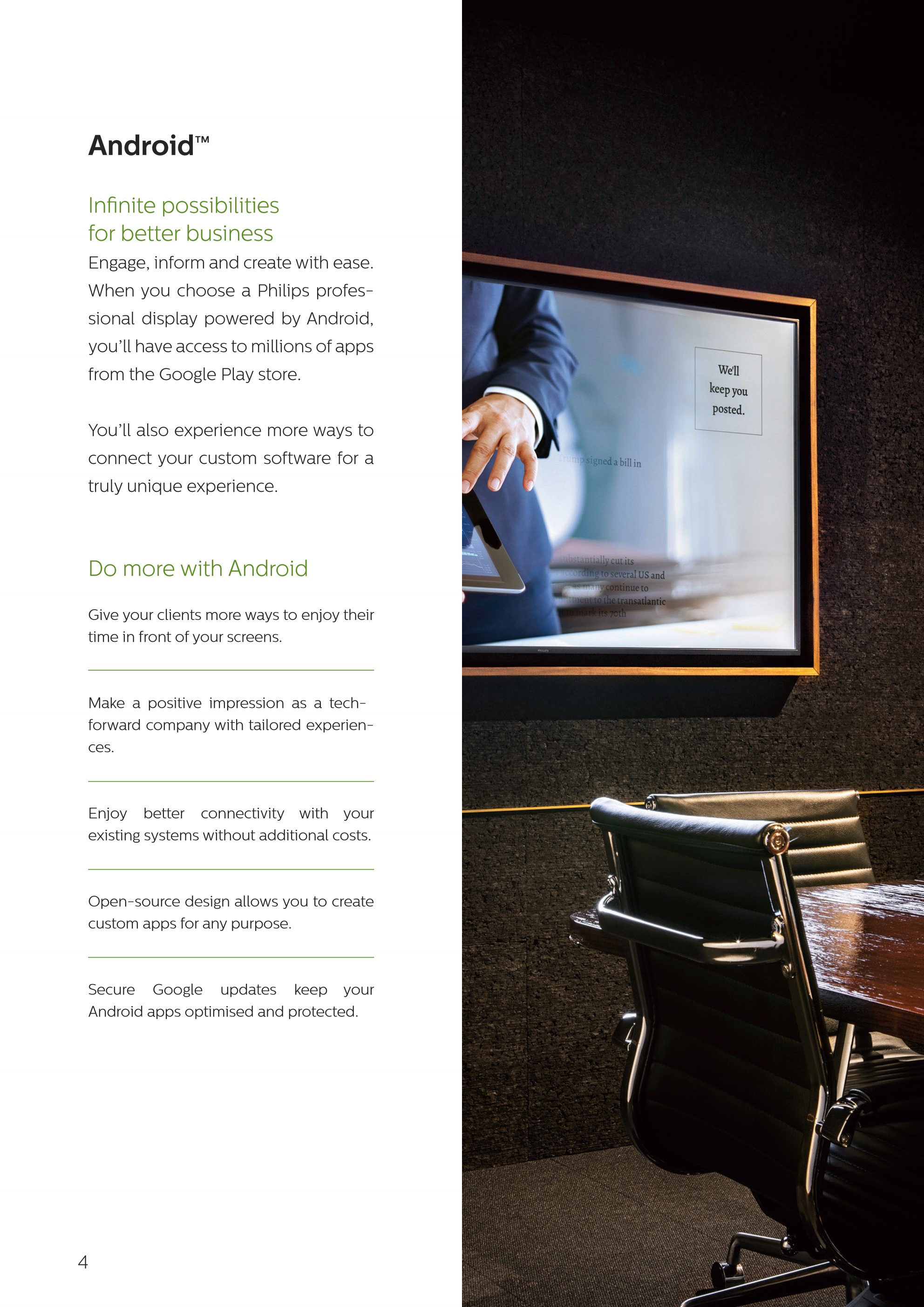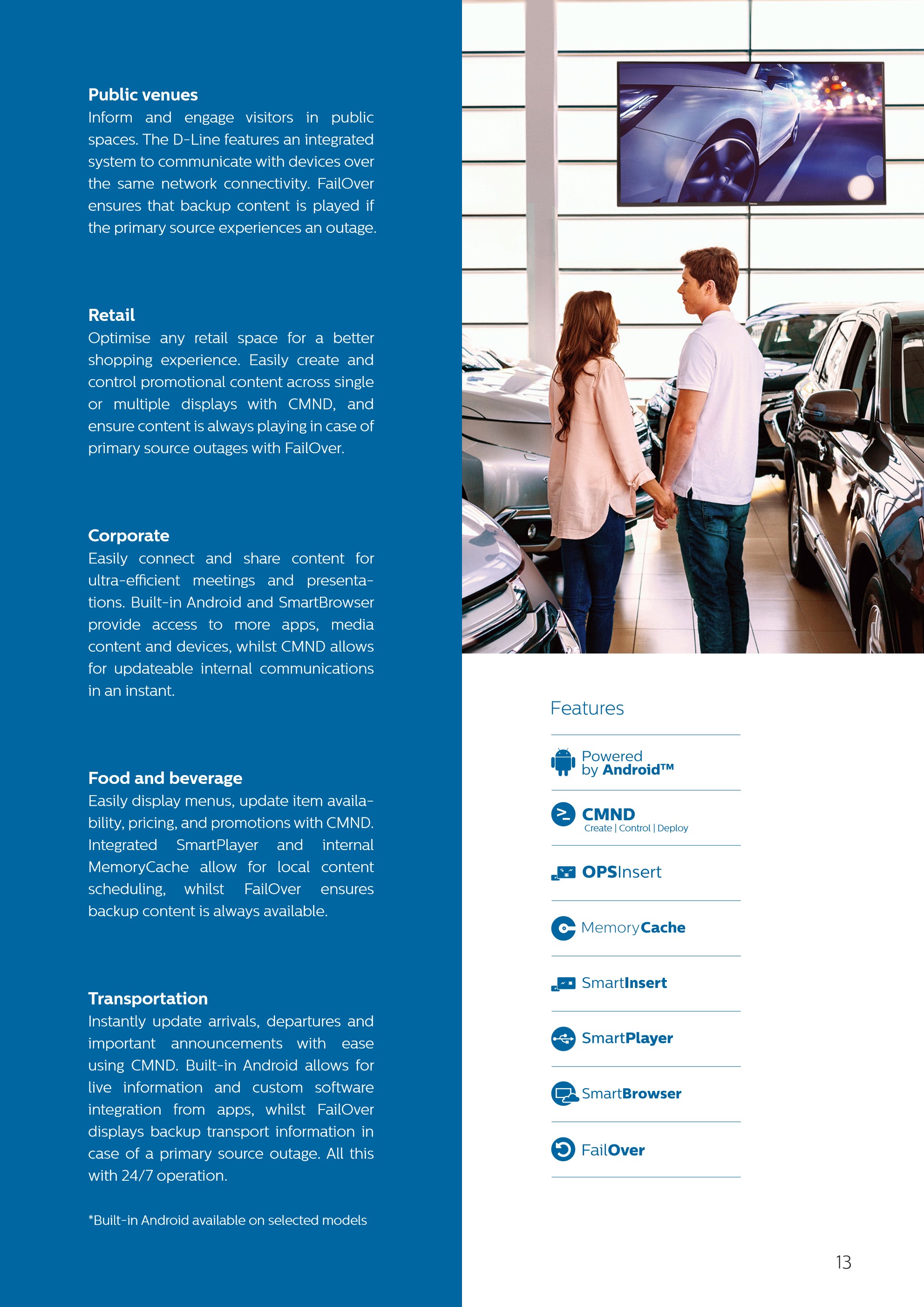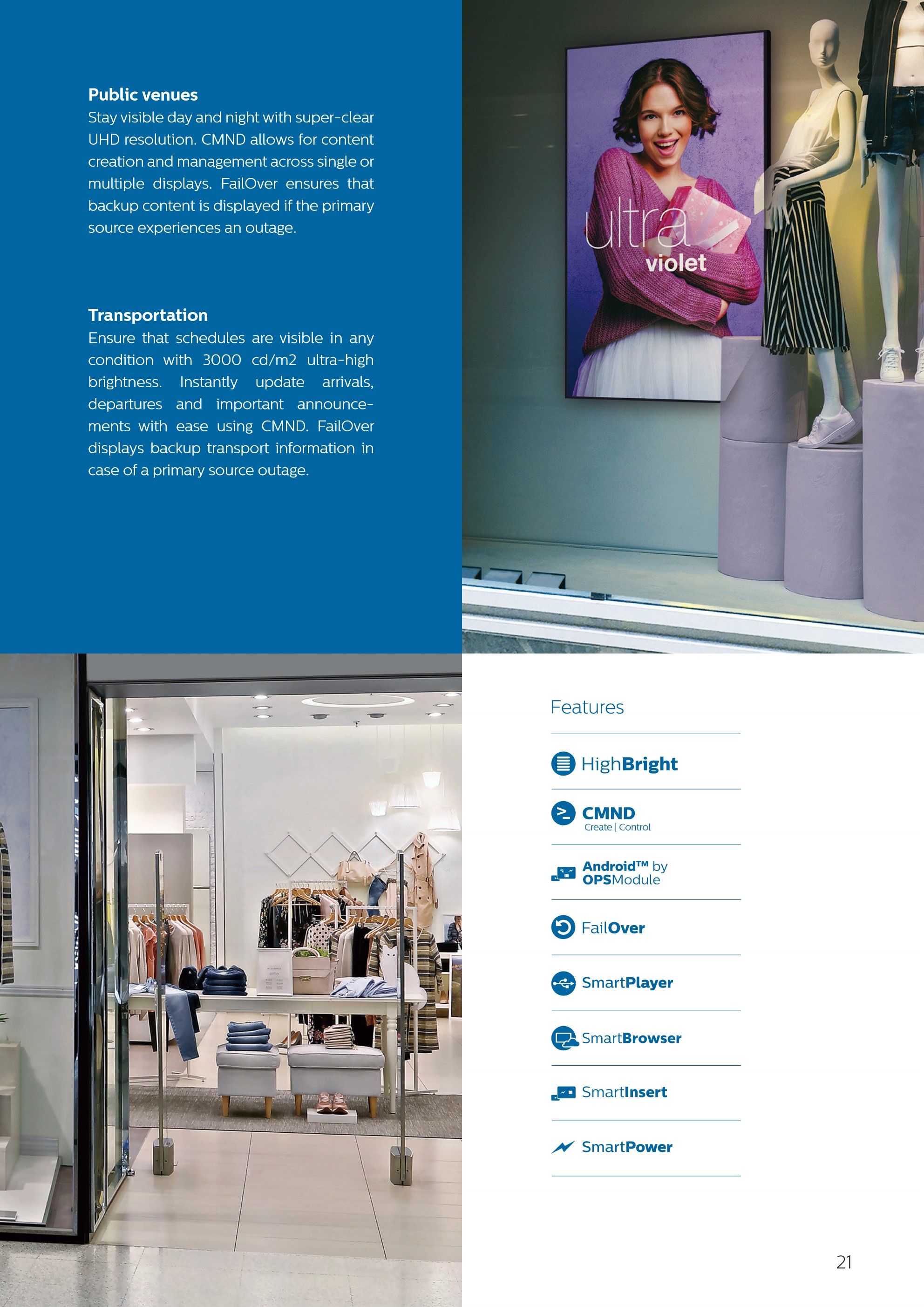 Working with the team at Philips Professional Display Solutions, I had the privilege of creating their annual product range brochure of professional displays and signage solutions. This range discovery guide is one of the most significant business to business pieces for the brand, comprising the entire collection, and published across all global markets. I crafted the identity and copy for each product, as well as the copy for the various technologies. I also formulated a content structure to make it easy for the reader to understand the advantages of each product based on their vertical market.